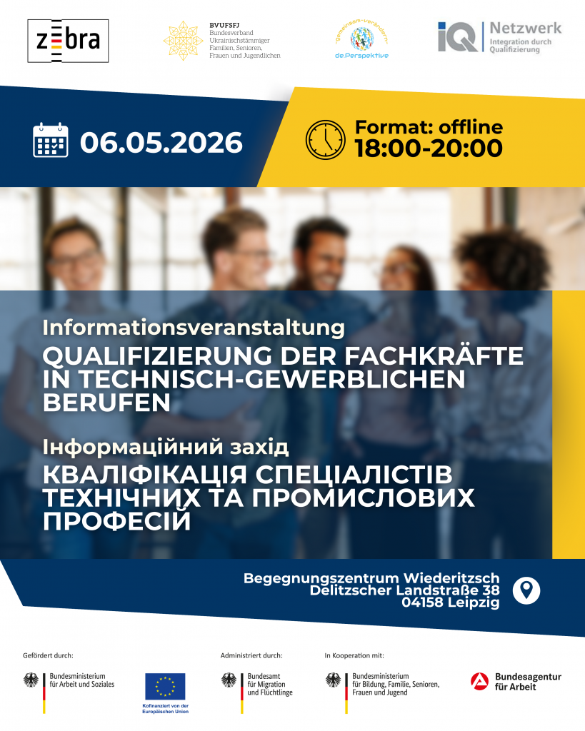 Wir laden dich zu einer kostenlosen Informationsveranstaltung vor Ort „Qualifizierung der Fachkräfte in technisch-gewerblichen Berufen“ ein! Die Veranstaltung ist besonders relevant für Personen, die in Leipzig und Umgebung leben. Inhalte der Veranstaltung: – Möglichkeiten für Fachkräfte in technisch-gewerblichen Berufen – Arbeitsmarktchancen in Leipzig – Beratungs- und Unterstützungsangebote – Welche Unterstützungs- und Beratungsangebote das Programm IQ – Integration durch Qualifizierung bietet.